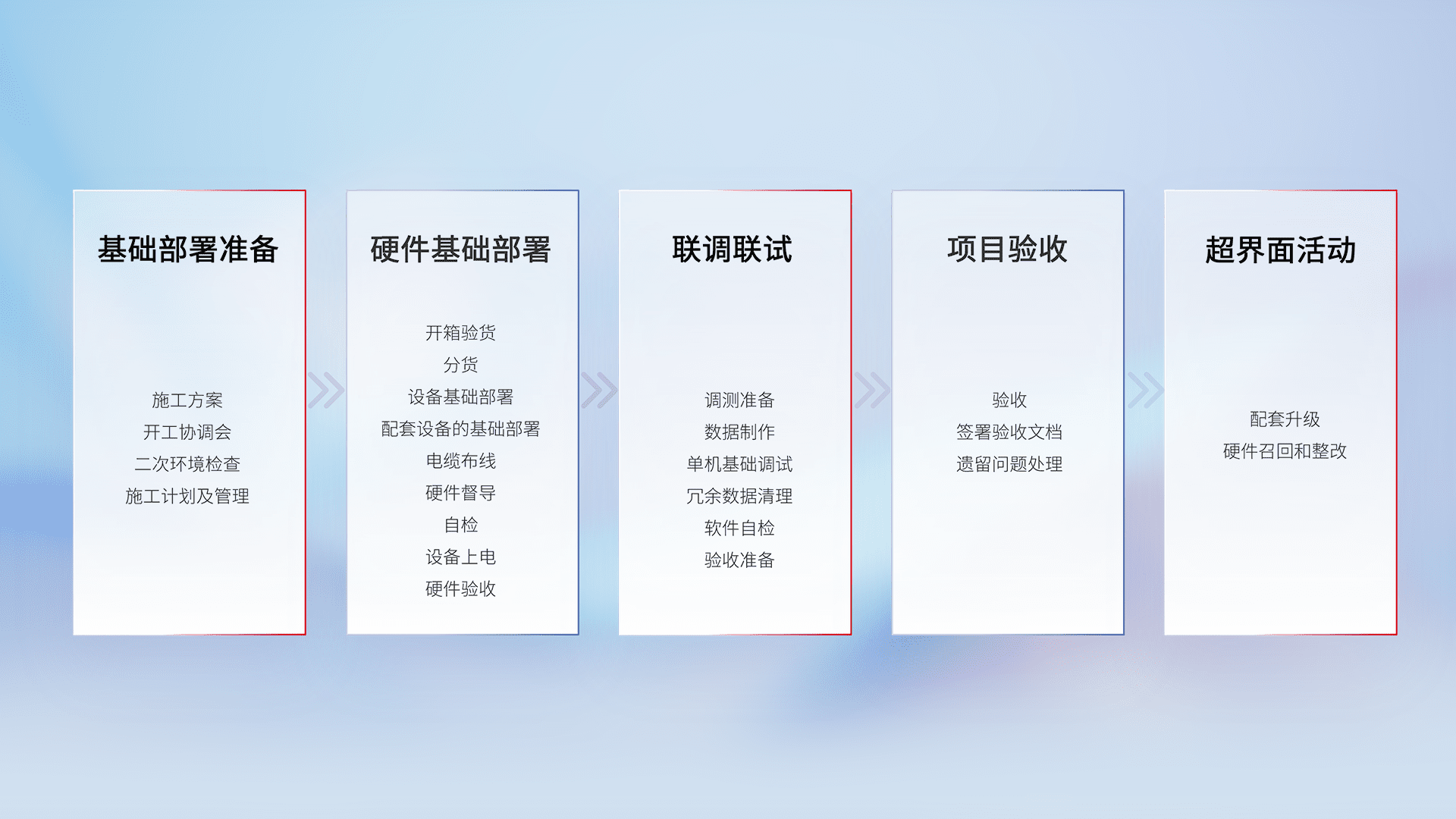 从基础部署准备、、、硬件基础部署、、、、联调联试、、项目验收、、、越界面活动的全过程可追溯,,,,保证施工质量和进度。。。。